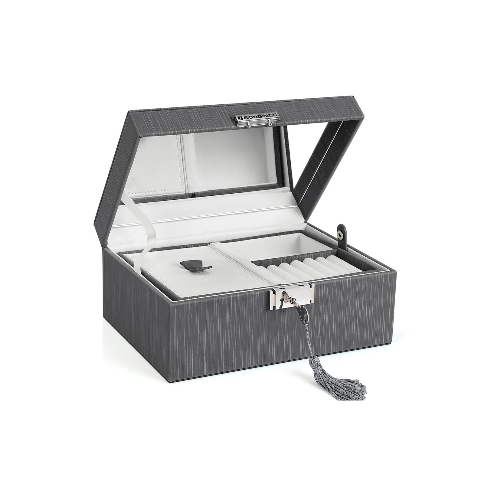 SONGMICS sieradendoos, PU, sieradendoos, opbergruimte op 2 niveaus, een afneembare en scharnierende reisdoos, met spiegel op de deksel, zwart JBC232BK